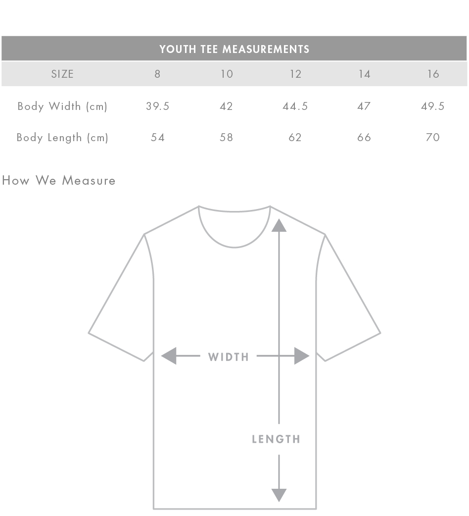 FIT: Regular fit - please check the size chart to avoid disappointment. Lay your own tee flat on a table, measure armpit to armpit across the chest and match to the size you feel is best. Please note measurements can vary within 2.5cm, this is within the accepted tolerance.