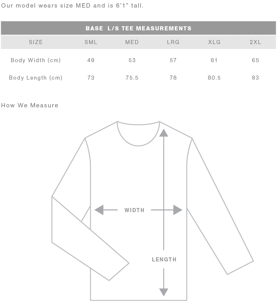 FIT: Regular Fit - please check the size chart to avoid disappointment. Lay your own tee flat on a table, measure armpit to armpit across the chest and match to the size you feel is best. Please note measurements can vary within 2.5cm, this is within the accepted tolerance.